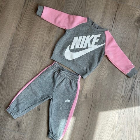 Joggedress med zipjakke og bukse str 98/104. Brukt samtidig. En liten løs tråd på søm arm, noen antydninger til ujevnhet i fargen et par steder, kun synlig om du leter.
