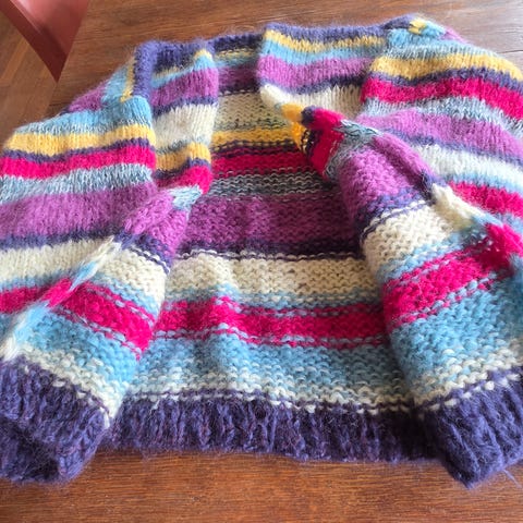 Hjemmestrikket restegarnsjakke i retro farger, StrS/M . Ullvask 30 grader. 640 kr