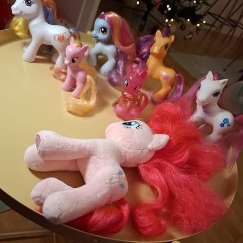 My Little Pony samling med flere ulike figurer i forskjellige farger og med variert hårstil. Figurenes størrelse er liten, egnet for barn. Materialet er plast med syntetisk hår. Passer som leker eller samleobjekter. Fra 8-11cm. 2 av figurene mangler vinger
