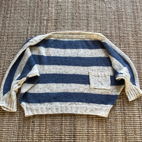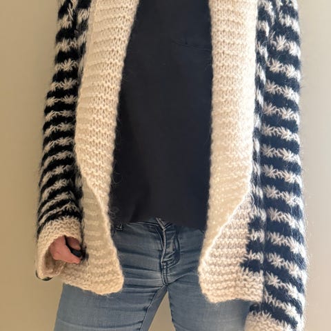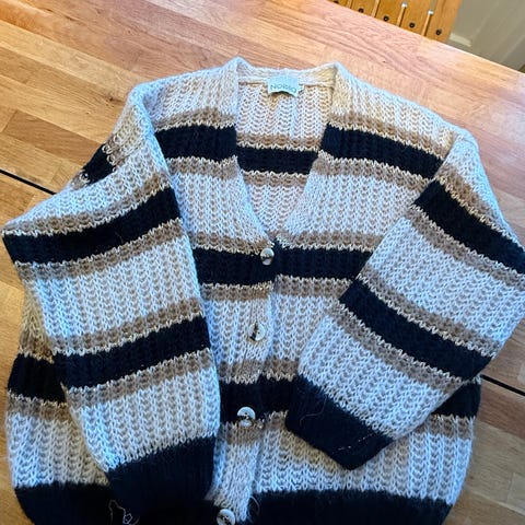 Pen cardigan i beige og mørk blå. Kan sendes for 69kr