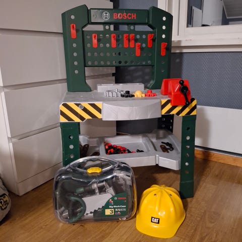 Pent brukt verktøybenk / arbeidsbenk for barn. Har selvfølgelig noe bruksmerker her og der, og noen småhakk - men ingenting av betydning. Selges likevel billig på grunn av dette. Koster rundt 1500 kroner ny.