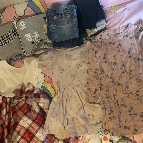 Pent brukt klespakke str 110, bestående av tre bukser fra Zara, en jakke fra Hm og en kjole fra HM. Brukt til ett barn.