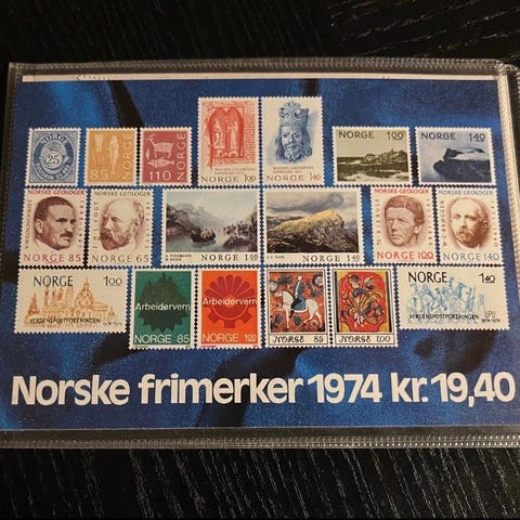 Norske Frimerker 1974 Frimerkesett med ulike motiver og valører. Settet inneholder flere frimerker fra Norge utgitt i 1974, inkludert portotakster og illustrasjoner. Frimerkene varierer i farge og design, og er egnet for samlere eller postale formål.