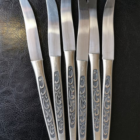 Knivene på bildet er vintage fruktkniver eller påleggskniver laget av Geilo Tinn i Norge.