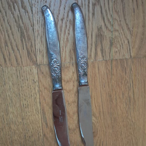Knivene har synlige bruksspor og selges samlet for 50,-
