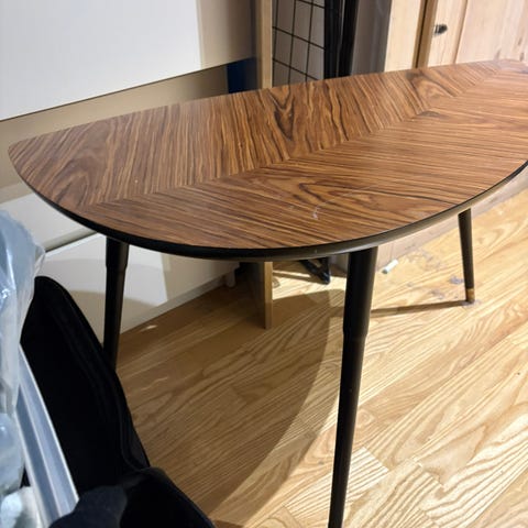 Brun treimitert bordplate med sorte bein og messingfarget beslag nederst på beina.