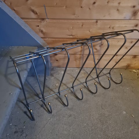 Solid hvitmalt tre knaggrekke/hatteylle med stang og knagger av metall. Bredde 80cm, høyde 31,4cm, dybde 34,4cm.