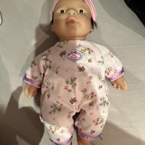 Dukke iført rosa pysjamas med hvite stjerner. Dukken har lukkede øyne og blondt hår. Inkluderer en rosa genser med sjiraffmotiv, en rosa sovepose med stjernemotiv og to små sko. Passer til barn som leker med dukker og tilbehør.