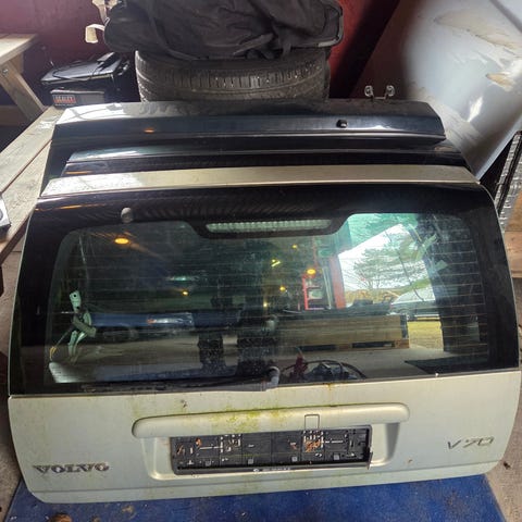 Hel og pen komplett bakluke kr 1000, Venstre sidedør kr 800. frontlykter kr 500 pr stk, sidespeil til Volvo V 70 uten elektriske ledninger kr 300. Bor i Hokksund, men kan sende... telf 4848 1820