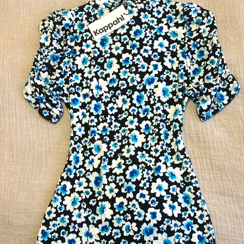 KappAhl T-skjorte i størrelse XS for dame, grå farge. Laget av bomull med rund hals og kort erme. T-skjorten har et trykk med naturmotiv på fronten. Passer til hverdagsbruk.
