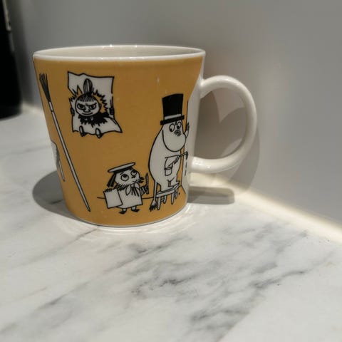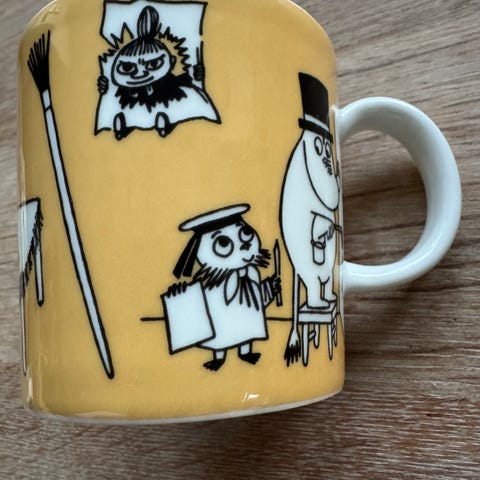 Denne koppen dukker sjelden opp for salg i Norge og ekstra sjeldent med etikett og i nystand, som denne. Denne Mummikoppen er nok den som har hatt størst verdistigning de siste årene og det er nok fordi den kun ble produsert i få år og fordi det finnes få igjen i god stand da disse lett får skraper og hvite prikker som er godt synlig pga brun farge.