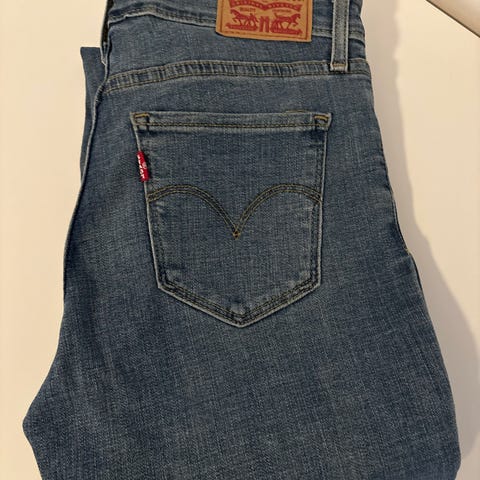 Levi's 721 Skinny Jeans i blå farge, størrelse W28 (midje) og L32 (lengde). Laget av denimmateriale, designet for kvinner. Jeansene har klassiske detaljer som lommer bak og Levi's røde merkelapp.