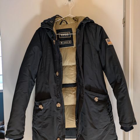 Svært lite brukt Svea miss brown parkas, med ekte pels. Fargen er navy og størrelsen er XS.