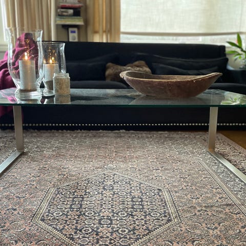 Bordet har ingen stygge merker og fremstår helt og pent. Glassplatene er løse, så bordet er greit å transportere.