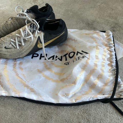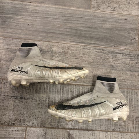 Nike fotballsko i størrelse 41. Lengde utside: 27 cm. Fargene er hvit og rød med svarte detaljer. Skoene har knotter på undersiden for bruk på kunstgress og gress. Skoene er rengjort og har ingen synlig slitasje.