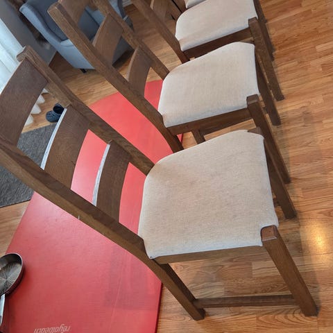 Eldre stoler selges samlet for kr 500.- Trenger vask og rens, ev. at man trekker om setene. Ble trukket om ca 10 år siden. Ellers er stole hele og har ingen løse deler. Vært de siste årene brukt som ekstra spisestuestoler ved behov.