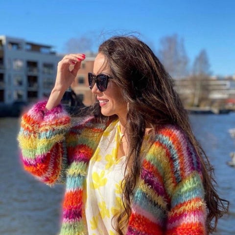 100% strikket lin, ganske tykt garn, veldig behagelig kvalitet. Fin melert grønnfarge. Ganske elastisk og tilpasser seg kroppen. Brukt en gang, den er dessverre litt for liten for meg.