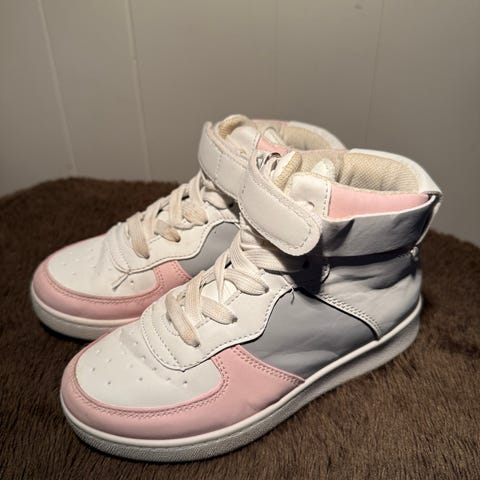 Barnesko i størrelse 30 med hvit farge og rosa detaljer. Skoene har snøring og en flat såle. Materialet er ikke spesifisert, men skoene fremstår som egnet for daglig bruk.