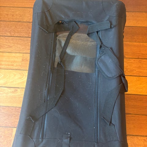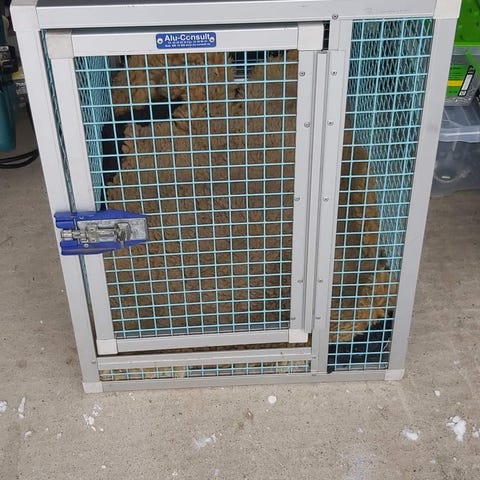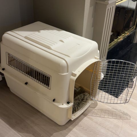 Selger et eldre hundebur. Litt usikker på målene, men ca. 80 X 100 cm vil jeg tro. Buret er i god stand bortsett fra et håndtak på toppen som mangler.