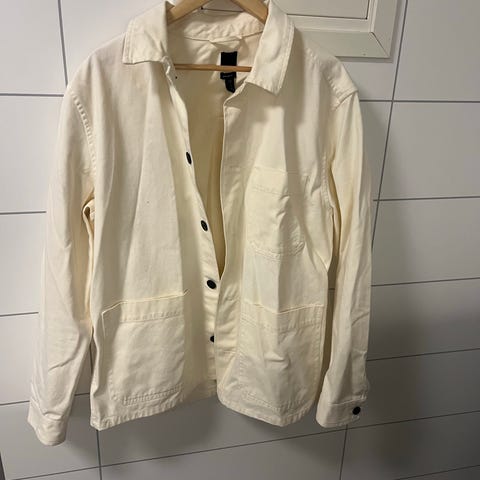 H&M Relaxed Fit jakke i størrelse XL, farge grå. Jakken har en avslappet passform og er laget for menn. Den har knappelukking og brystlommer med klaff. Materialet gir en myk og komfortabel følelse.