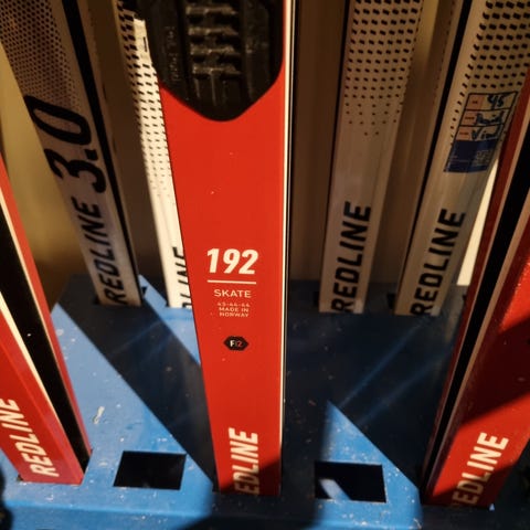 Madshus Skate Redline 24/25, F2 konstruksjon, M61 Slip, 192cm, målt opp til 72kg, pris: 4200kr