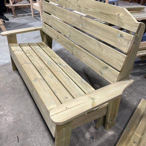 Seksksidet benkbord laget av tre, egnet for utendørs bruk. Bordet har seks sitteplasser integrert rundt bordflaten. Designet for å gi plass til flere personer samtidig, og passer godt til hage eller uteområde.