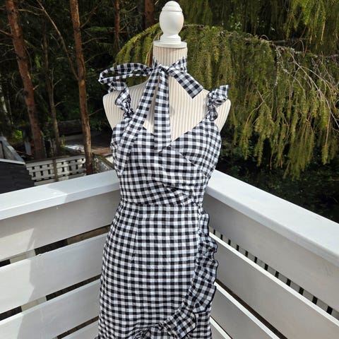 Bik Bok kort Festkjole i størrelse S for jenter/ungdom. Kjolen er beige/rosa med svarte polkadotter, uten ermer og har en sort sløyfedetalj i ryggen. Materialet er glatt og kjolen har et underskjørt med rosa tyll for ekstra volum.