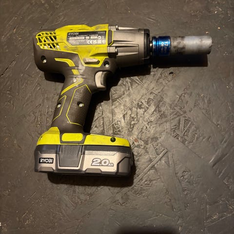 Leier ut et komplett Ryobi muttertrekker-sett med batteri, lader og minikompressor. Utstyret er ideelt for dekkskift og andre oppgaver som krever kraftig og pålitelig verktøy.