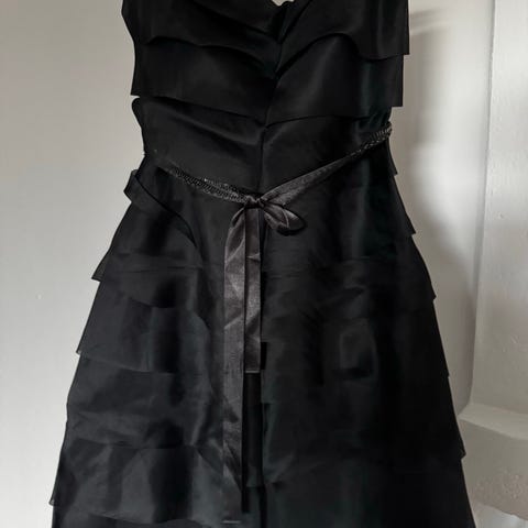 Bik Bok festkjole i svart farge, størrelse 40 for kvinner. Kjolen har et elegant design med satengdetaljer og en dekorativ sløyfe i midjen. Materialet er glatt og gir en formell stil, egnet for festlige anledninger.