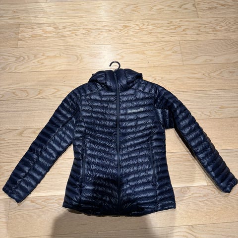 Vikafjell Annet dunjakke for dame i størrelse S. Jakken er marineblå og har glidelås foran med to sidelommer og en brystlomme. Materialet er lett og isolerende, egnet for utendørs bruk i kjøligere vær. Jakken har elastiske mansjetter og en høy krage for ekstra beskyttelse mot vær