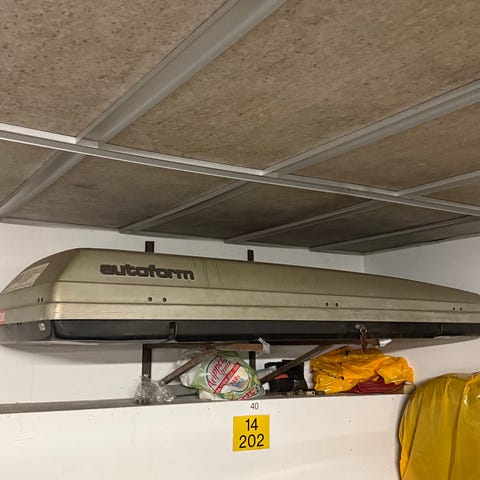 Fra ca 1990? Har ikke vært brukt på en del år. Oppbevart i carport. Låser fungerer som de skal. Fester for klassisk firkantet takstativ. Hel og fin.