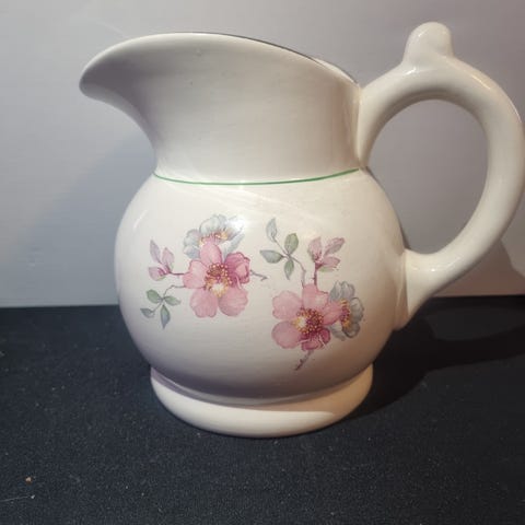 Nydelig munnblåst vintage mugge i frostet glass. Fin håndmalt dekor med jordbær og jordbærblomster. Muggen er ca 11,5 cm høy, 8 cm i diameter og rommer 6 dl, perfekt til dessertsauser! Hel og fin uten nagg eller andre feil, kuleslipt under.