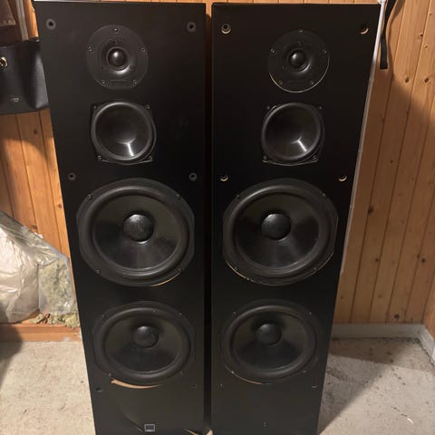 Høyttalerene er litt slitt kosmetisk, kabinett har en del bruksmerker. Folie på frontene har løsenet flere steder også. Det var et vanlig problem på denne serien fra Dali, det er limet som løsner.