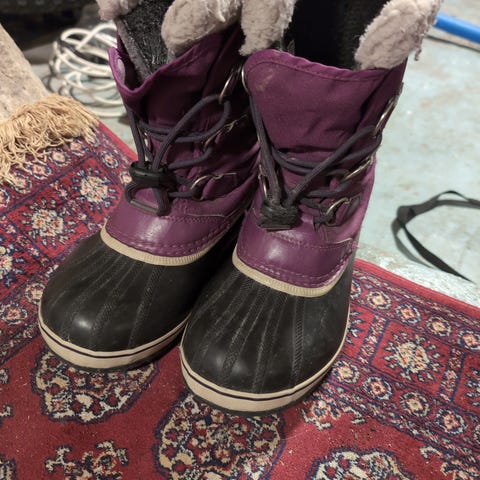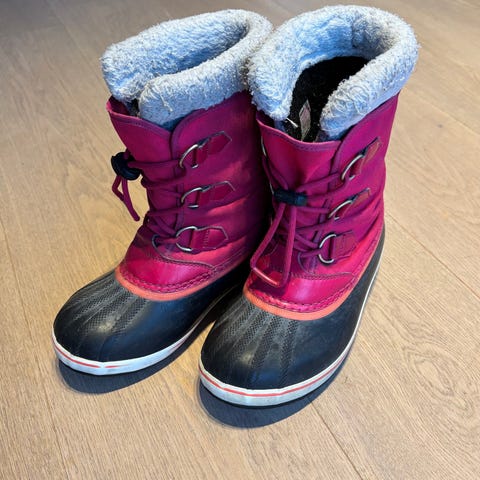 Sorel barnesko for jente i størrelse 39. Skoene har en vinrød overdel med svart såle og er foret med mykt, varmt materiale for ekstra komfort og isolasjon. Egnet for bruk i kaldt vær.