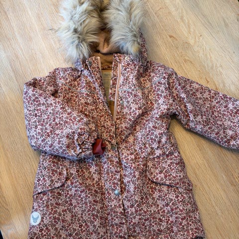 Wheat Parkas Jakke i størrelse 98 for jente. Jakken har flerfarget mønster, hette med avtagbar pelskant og fleecefôr for ekstra varme.