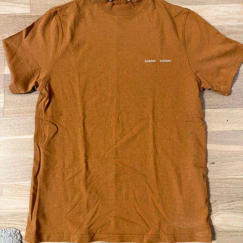 H&M Relaxed Fit T-skjorte i størrelse S for menn. T-skjorten har en oransje farge og er laget i et materiale som gir en avslappet passform. Den har trykkdetaljer på både front og rygg.