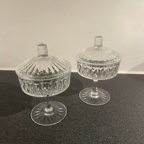 Glass skål som aldri har vært brukt til mat, kun til pynt selges for 100 kr.
