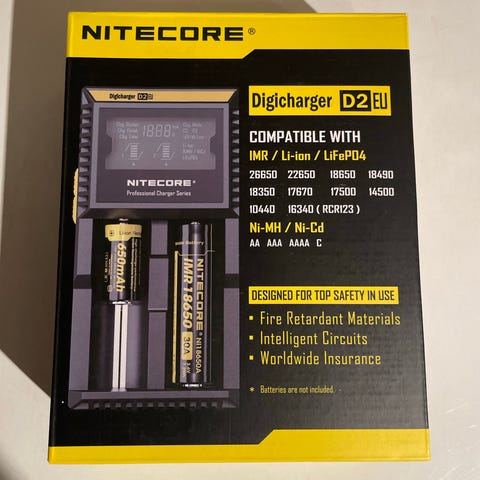 En praktisk lader som lader litt andre batterier enn de vanligste. Med tydelig display. Litt mer info: https://charger.nitecore.com/product/d4