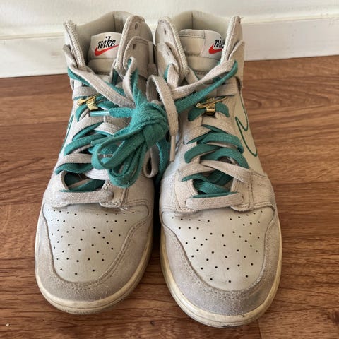 Lett brukte Nike Dunk High SE Poatinum sko selges fordi de har blitt for små. Pris kan diskuteres
