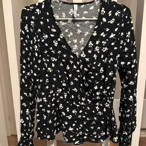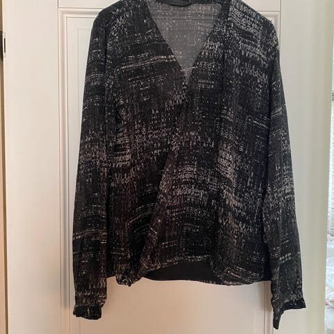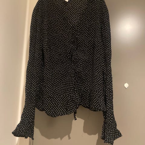 Svart omslagstopp med hvite prikker. Pent brukt i str xs. Må hentes i Kristiansand eller sendes om kjøper betaler frakt.