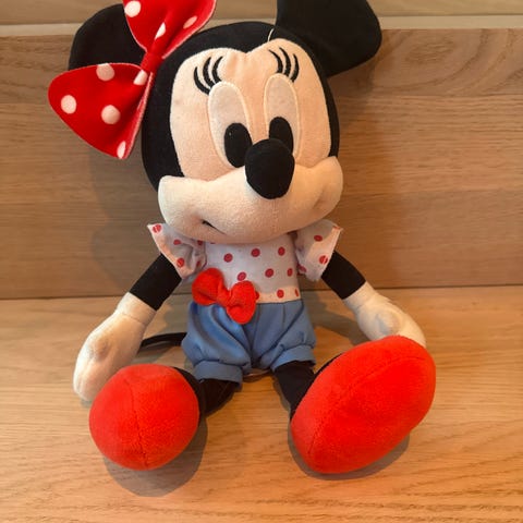 Disney Minnie Mouse kosedyr med blå kjole og sko med hvite prikker. Laget av mykt materiale, egnet for barn. Dukken har detaljer som hansker og sløyfe, og er designet for lek og samling.