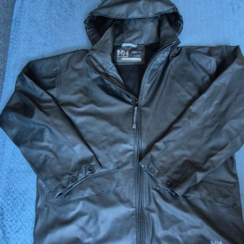 Helly Hansen jakke i størrelse 152, svart farge, egnet for barn og unisex. Jakken har hette og er laget av lett materiale.