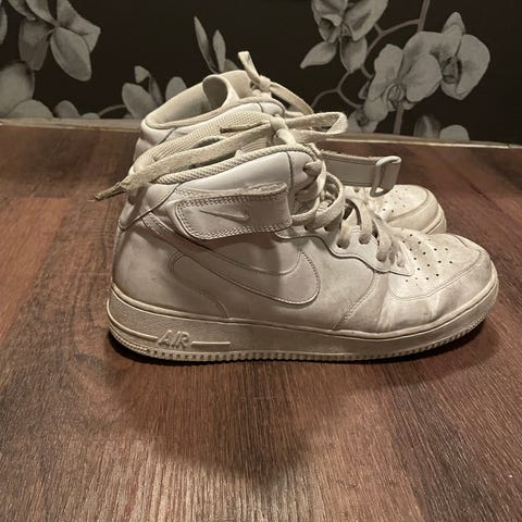 Nike Blazer Mid '77 sneakers i størrelse 44,5 for herre. Skoene har en kombinasjon av grå, hvit og gul farge. Materialet består av lær og tekstil. Designet er høyanklet med klassisk Nike Swoosh på siden og detaljert med gul bakside og grå lisser.