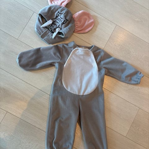 Pent brukt elefant kostyme i str 92. Kostymet består av heldrakt/heldress og hette/lue med elefantører og fjes. Det har borrelår fremme på brystet og under haken for enkel påkledning. Pent og lite brukt.