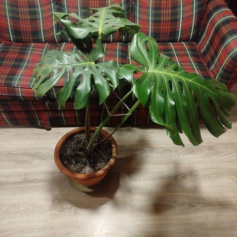 Høy monstera som trenger litt kjærlighet. Følger med kokospinne, men ikke potten.