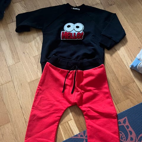 Selger dette fine settet/ joggedrakten i str ett år/ 12md. Grå genser med dinosaur på som kan åpne munnen og grønn bukse med orange detaljer. Nyvasket.