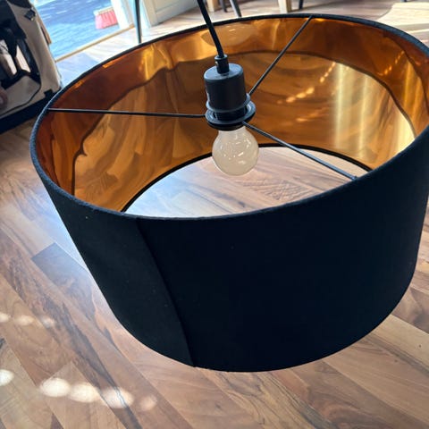 2 stk flotte lampeskjermer i svart fløyel og gullinnside selges da de ikke blir brukt. Den ene har fortsatt lapp og plast på, den andre er også ubrukt men prøvd. På den ene følger det med en pæreholder (med ledning). Gullinnsiden gir et vakkert og behagelig lys. Nypris 598,- per lampeskjerm.