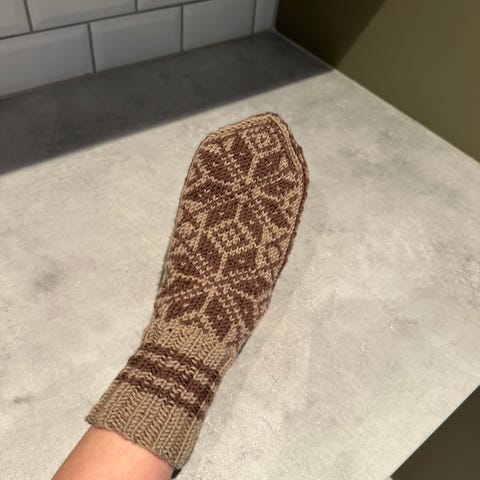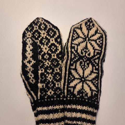 Nye, hjemmestrikkete votter i størrelse medium til small. Farge sort og hvit.