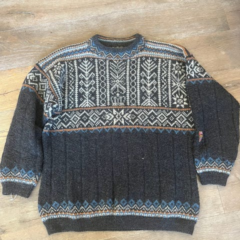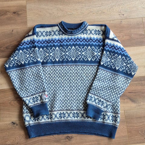 Selger en strikkegenser i setesdalsmønster i str L. Pent brukt. Et par minimale misfarginger, se bilde. Selges for 500 kr.