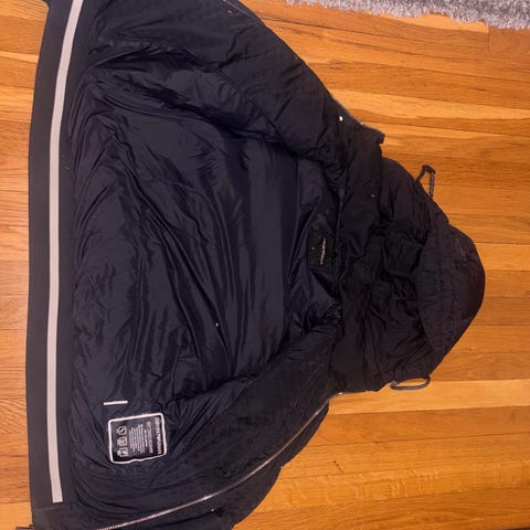 Armani Jakke i størrelse L for herre, farge svart. Jakken har et ytterstoff som ser ut til å være vannavstøtende, med en innvendig fôr av pelsmateriale for ekstra varme. Den har glidelås og knappelukking foran, samt en høy krage som kan lukkes for beskyttelse mot vær. Jakken har lange ermer og en justerbar midje på baksiden for bedre passform.